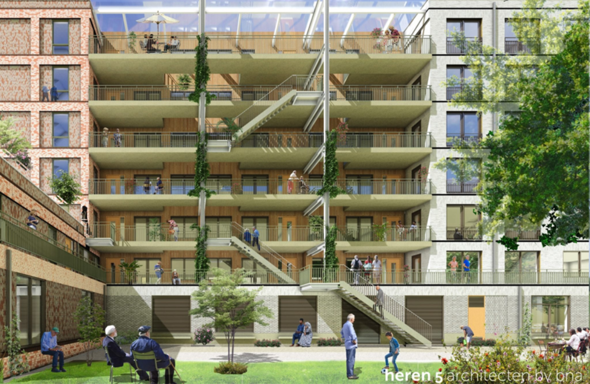 In Stadsveteraan 020 wonen huurders zelfstandig of delen een woning met een of twee anderen, en beschikken over collectieve ruimten en gedeelde faciliteiten, zoals de kookstudio, tuinkamer en schitterende binnentuin. Sjuul Cluitmans van Heren 5 architecten: “Stadsveteranen kiezen bewust voor stads wonen: een compacte woning, delen van faciliteiten en elkaar een handje helpen waar het uitkomt. Die opzet komt terug in het ontwerp van het gebouw, dat met gemeenschappelijke ruimtes en slimme looproutes ‘een alibi tot ontmoeten’ biedt. Dat gaat eenzaamheid tegen en zorgt dat huurders langer zelfstandig kunnen wonen.”