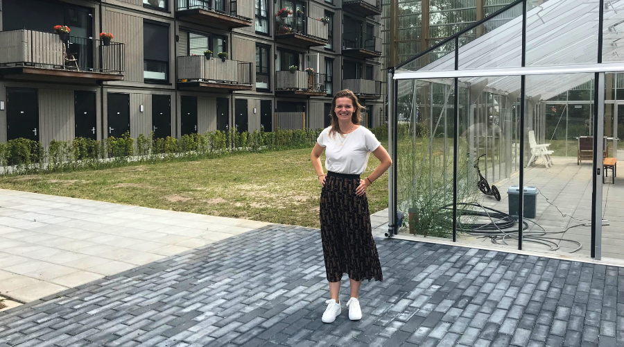 Zichtbaarder kan Lotte niet zijn: haar werkplek bevindt zich in een glazen kas in de binnentuin van het appartementencomplex, waar ze als community builder betrokken is. De kas is omringd door de woningen. Zichtbaarheid is in haar rol belangrijk. Lotte is van oorsprong maatschappelijk werker bij MEE & De Wering en als Community Builder is ze betrokken bij het nieuwe appartementencomplex Over De Die in Alkmaar. Corporatie Woonwaard heeft het complex recentelijk ontwikkeld. Ze mag twee jaar lang twintig uur per week werken aan gemeenschapsvorming en vindt dat fantastisch.