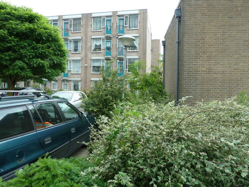 Een groot transformatorhuis, een blinde muur en een parkeerterrein voor de deur ontnemen het zicht op de ingang van het Aafje Zuidwijk gebouw. Van de saaie gemeentestruiken in het openbaar plantsoen lijkt ons geen mens blij te worden, net zo min als van de kale ruime stoepen. Er gaat hier geen enkele stimulans van uit om te denken, laat ik eens prettig aan de wandel gaan. Hoe het ook anders kan, zullen we bij een volgende zorgvisite laten zien. Zelfs een onding als een transformatorhuisje kan de lieveling van de buurt worden!