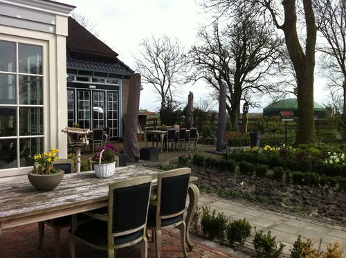 Ons valt ook op dat buiten de gebouwen allerlei landbouw- en tuinwerktuigen, zoals klompen, gieters, een hooivork en potten staan. En ook aan de buitenmuren hangt van alles. Heel gezellig en innemend. We denken: bij een zorginstelling zou dit nooit kunnen. ‘Veel te gevaarlijk’ wordt dan gedacht. Wat als iemand een hooivork pakt? Of struikelt? De hele wandel-, moes- en belevingstuin is van een flinke proportie en een natuurlijk onderdeel van het huis en zijn omgeving. Houten hekken eromheen, die geen opgesloten gevoel geven en waarbinnen de bewoners zich helemaal vrij kunnen bewegen.